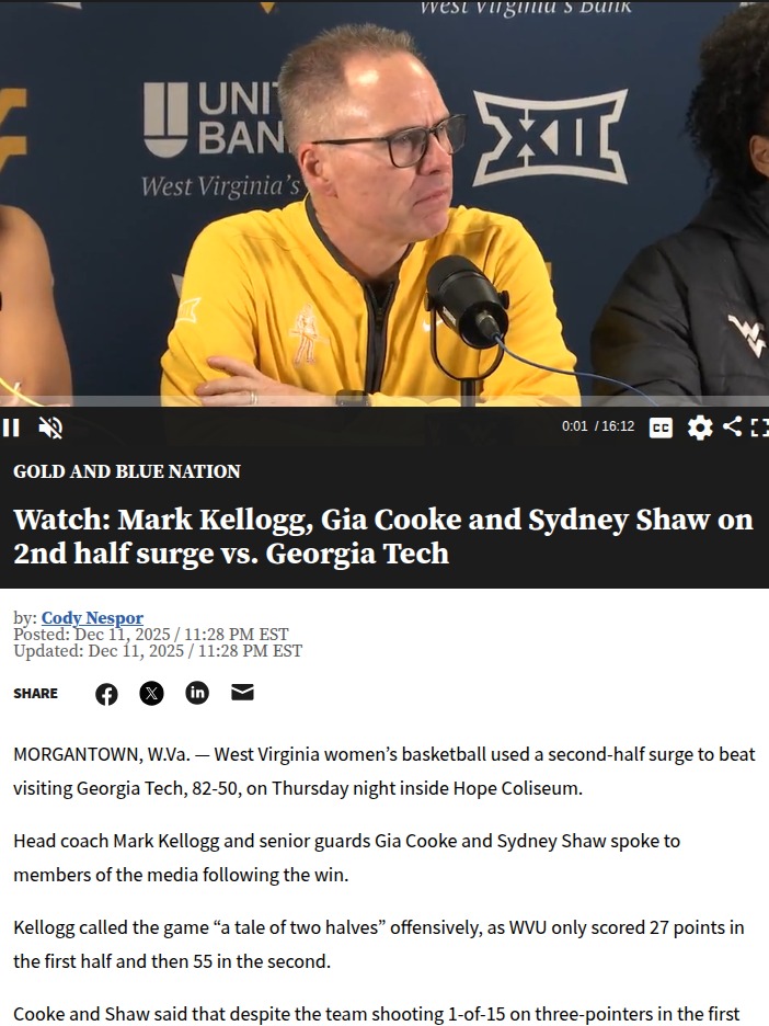 Oscar Gonzalez+FollowWVU women’s hoops light up Georgia TechWest Virginia’s women’s basketball team flipped the script in the second half, exploding for 55 points after a tough start and crushing Georgia Tech 82-50 at Hope Coliseum. Coach Mark Kellogg called it “a tale of two halves,” and guards Gia Cooke and Sydney Shaw said the team never lost confidence—even after hitting just one three-pointer in the first half. The coaches told them to keep shooting, and it paid off big time. Moments like this show how quickly a game can turn. What do you think sparked that second-half energy? #Sports #Basketball #WVU00Share