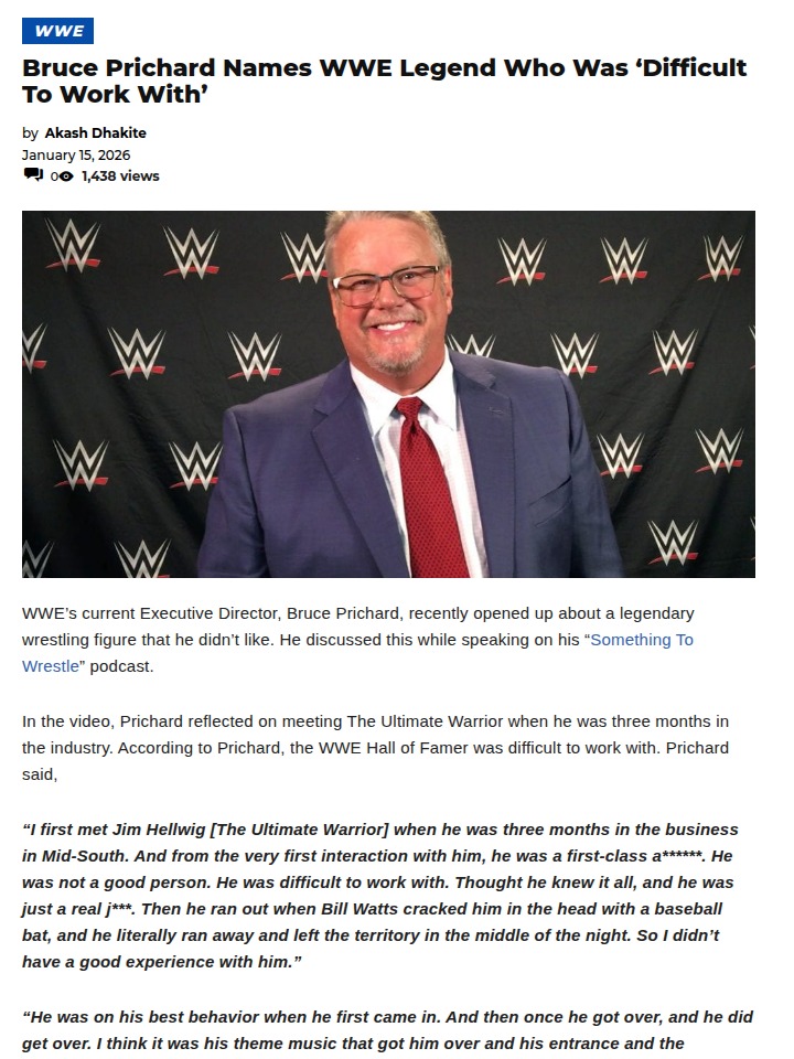 Kayla Mcconnell+FollowUltimate Warrior: WWE’s Most Polarizing Legend?Bruce Prichard just dropped some serious backstage tea on the “Something To Wrestle” podcast, calling The Ultimate Warrior one of the toughest guys to work with in WWE history. Prichard didn’t hold back, saying Warrior (aka Jim Hellwig) was a “first-class a**” from day one, but even he admits the guy’s entrance and charisma were next-level. Love him or hate him, Warrior’s legacy is as controversial as ever. What do you think—was Warrior’s attitude worth the hype? #Sports #Wrestling #WWE00Share