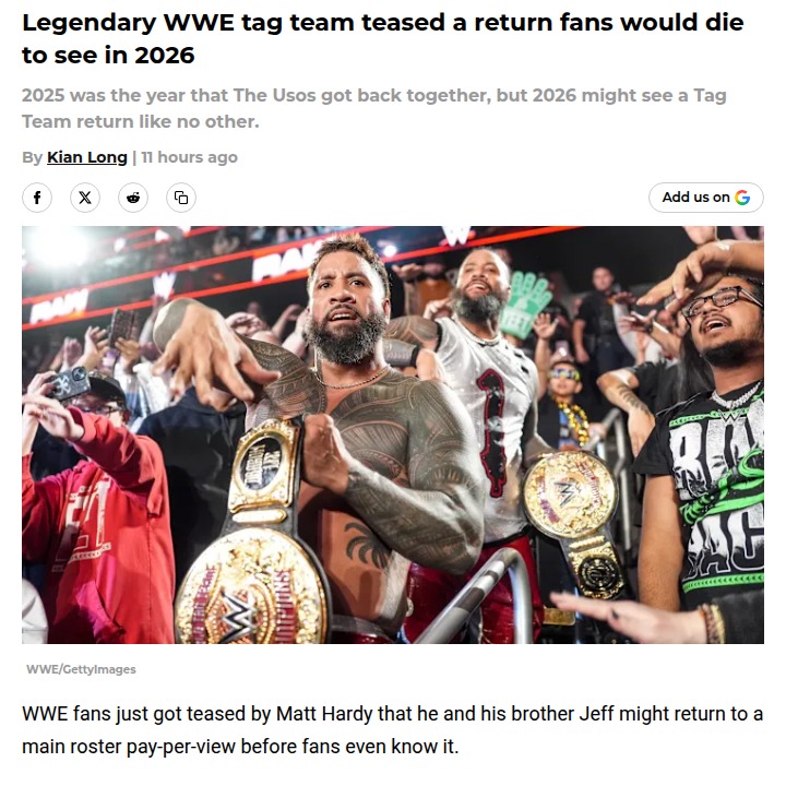 Kayla Mcconnell+FollowHardy Boyz Hint at WWE Main Roster ReturnMatt Hardy just sent shockwaves through the WWE Universe, teasing that he and Brother Nero could make a main roster pay-per-view comeback. The Hardy Boyz, current TNA champs, are legends who defined tag team wrestling. Imagine the electricity if they face The Usos and The New Day in a generational WrestleMania showdown! Matt’s comments make it clear: wrestling is at its best when it’s unpredictable, and the Hardys are ready to shake things up again. #Sports #Wrestling #WWE30Share