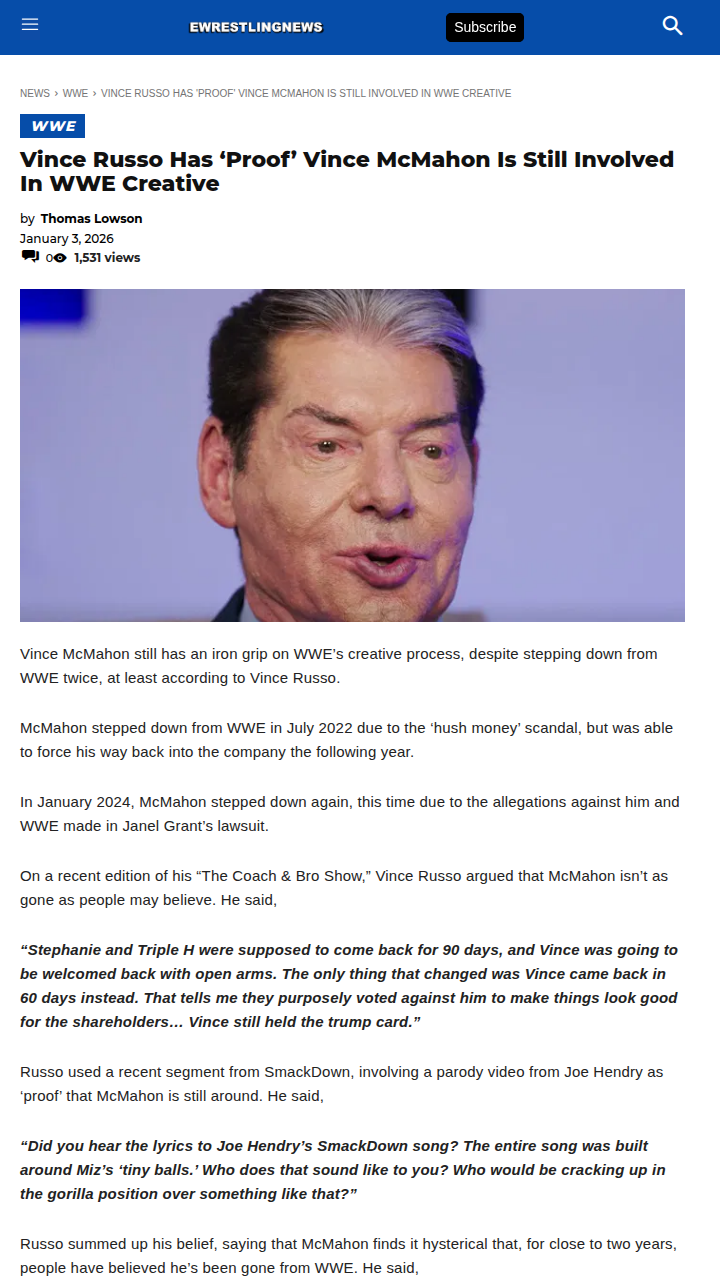 Daniel Peterson+FollowIs Mr. McMahon Still Pulling WWE Strings?Longtime WWE fans, what do you make of Vince Russo’s claim that Mr. McMahon is still calling the shots behind the scenes? Russo points to that wild Joe Hendry parody on SmackDown as classic Vince humor—think Miz’s ‘tiny balls’ gag. Even after stepping down (again) in January, Russo says the Chairman never really left creative. Is the ‘E’s creative direction still under the McMahon thumb, or is this just Russo stirring the pot? #Sports #Wrestling #WWE00Share