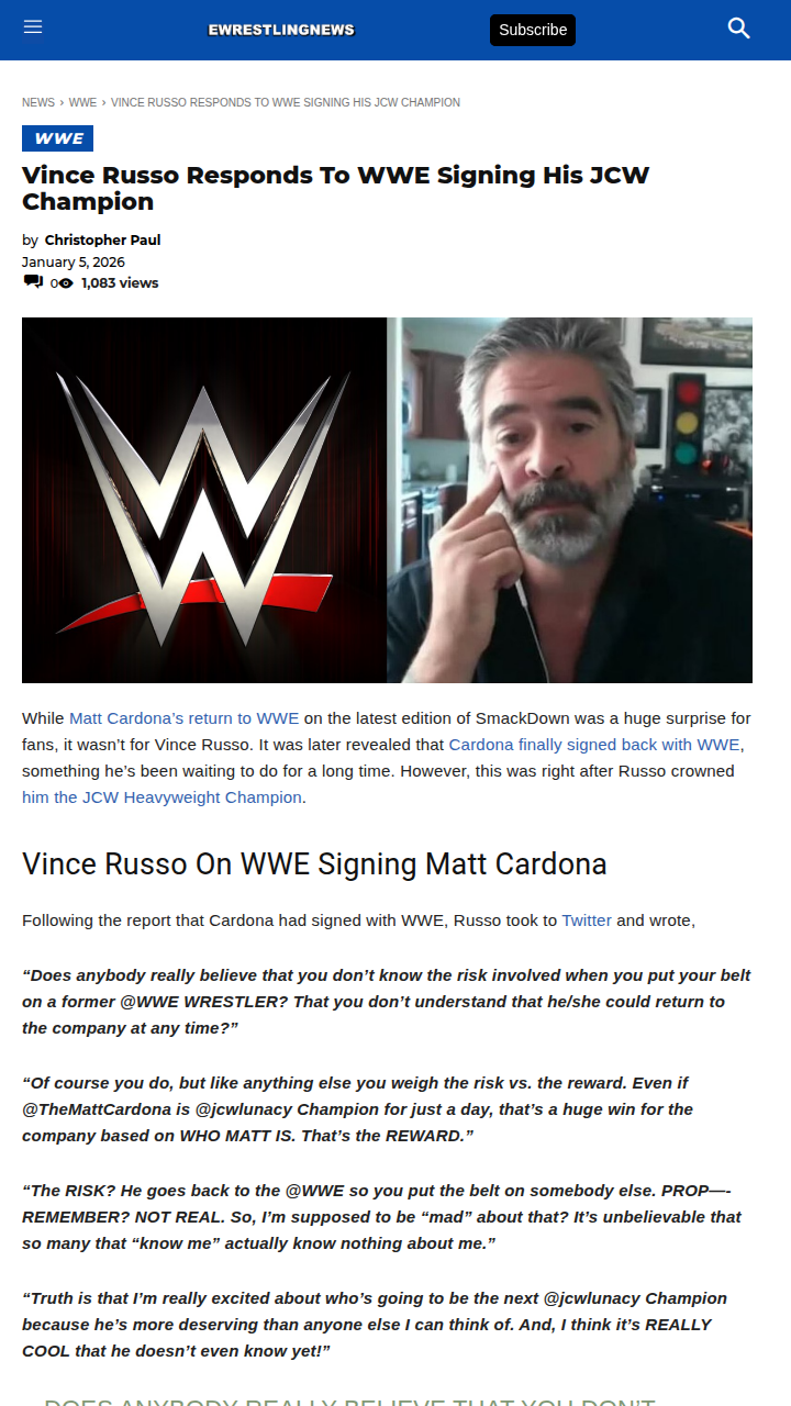 Stacie Lee+FollowCardona’s WWE Return Sparks JCW DramaMajor shakeup in the indie scene! Matt Cardona, fresh off being crowned JCW Champ by Vince Russo, shocked the universe by signing with WWE right after. Russo, never one to hold back, called it a calculated risk—putting the strap on a former WWE star always comes with the chance they’ll get called back to the big leagues. Now, the real question: who’s next in line for the JCW gold? #Sports #Wrestling #WWE00Share