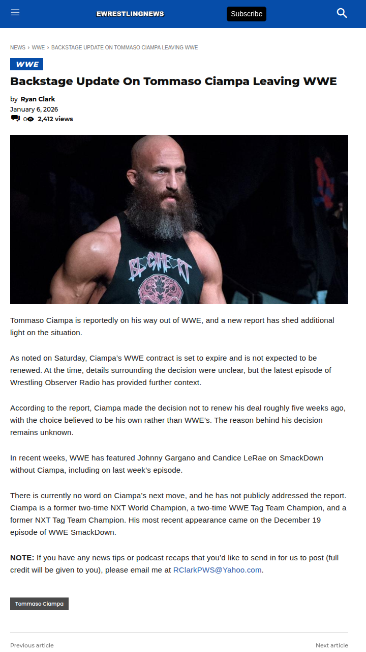 reneewang+FollowCiampa’s WWE Exit: DIY Era Officially Over?Looks like the Blackheart is closing the book on his WWE run. Reports say Tommaso Ciampa decided not to re-sign, ending his contract quietly about five weeks ago. No word yet on why he’s leaving or what’s next, but with Johnny Wrestling and Candice still on SmackDown, it’s the end of an era for DIY fans. Where do you think Ciampa lands next? #Sports #Wrestling #WWE40Share