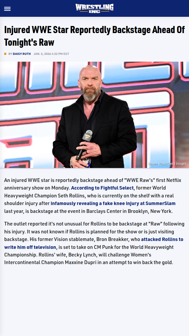 dbrown+FollowSeth Rollins Spotted Backstage at RAW!Big news for the WWE Universe: The Architect, Seth Rollins, has been seen backstage at tonight’s RAW, which marks the one-year Netflix anniversary. With Becky Lynch in a title match and a Stranger Things crossover on deck, fans are buzzing—could Rollins make a surprise return after his Crown Jewel injury? Or is he just there to support The Man? Sound off with your predictions! #Sports #Wrestling #WWERAW10Share