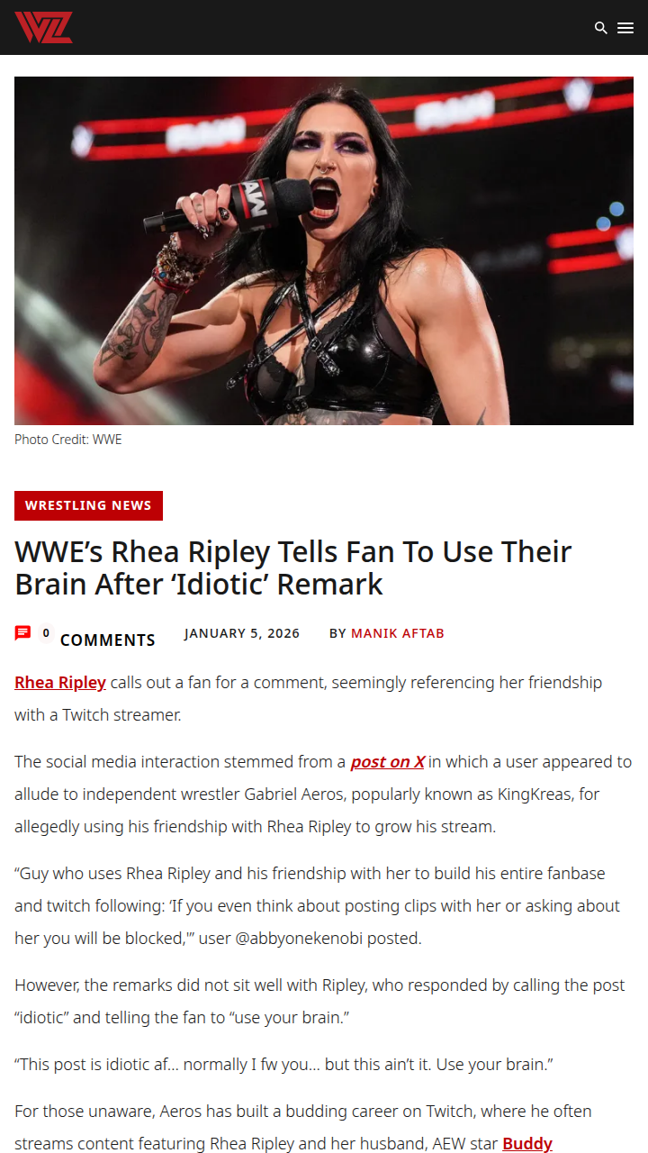 Kayla Mcconnell+FollowRhea Ripley Claps Back on WWE RAW NightMami doesn’t hold back! Rhea Ripley just shut down a fan on X for making a wild claim about her friendship with KingKreas. The fan suggested KingKreas was using Ripley to boost his Twitch, but Ripley called the post “idiotic” and told them to “use your brain.” With Ripley set to challenge The Kabuki Warriors for the Women’s Tag Titles tonight on RAW, the drama is heating up both online and in the ring. Thoughts on Ripley’s response? #Sports #Wrestling #WWERAW20Share
