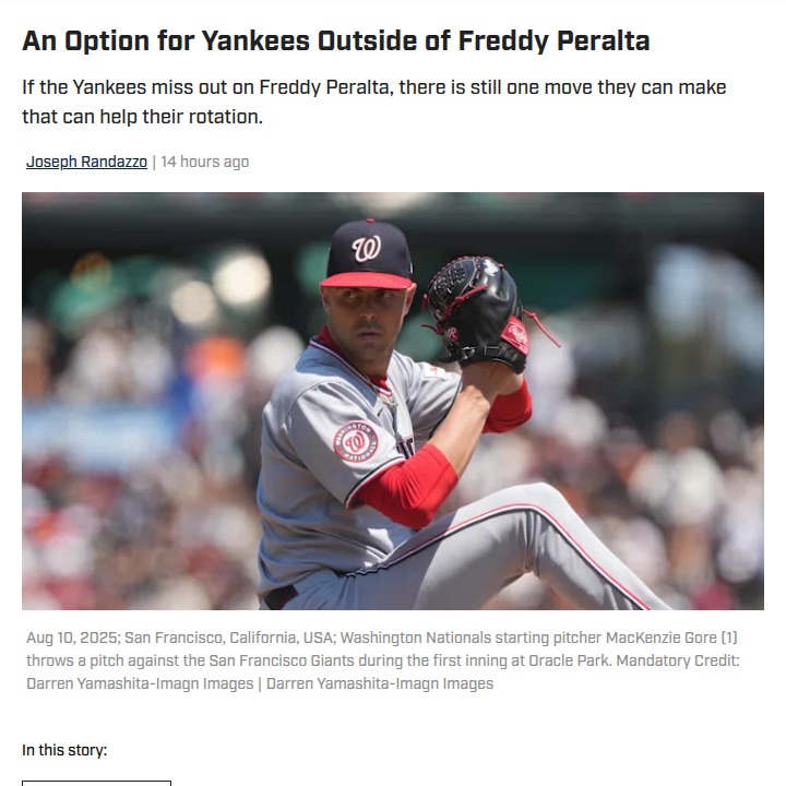 Maria Chavez+FollowYankees Eye Gore as Peralta Bidding Heats UpWith King Cole and Rodon on the shelf, the Bronx Bombers might have to pivot if the Freddy Peralta sweepstakes get too rich. The Dodgers’ stacked farm and Mets’ young arms could push the Yanks out of the running. That’s where MacKenzie Gore comes in—he’s not quite Peralta, but with years of control and big strikeout stuff, he could be a solid fit for the rotation. Not a blockbuster, but a smart move if the price is right. #Sports #Baseball #Yankees00Share