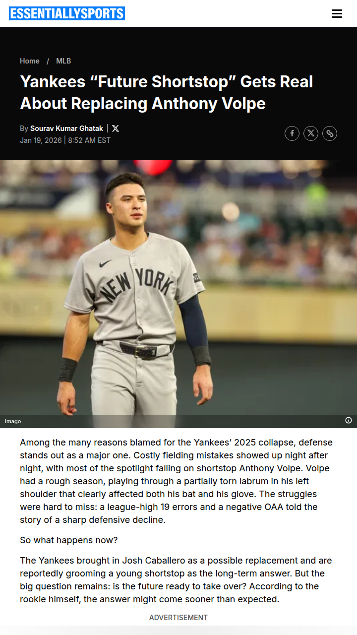 Catherine Reeves+FollowYankees’ Shortstop Dilemma: Volpe or Lombard?Yankees fans, the shortstop situation is heating up! After a tough year for Volpe (shoulder issues, 19 errors), the Bombers are eyeing George Lombard Jr. as the next big thing. Scouts are raving—some say he “plays circles around Volpe.” But Lombard’s keeping it humble, focusing on his game, not the hype. With Caballero in the mix too, who do you see as the Yanks’ future at short? #Sports #Baseball #Yankees10Share