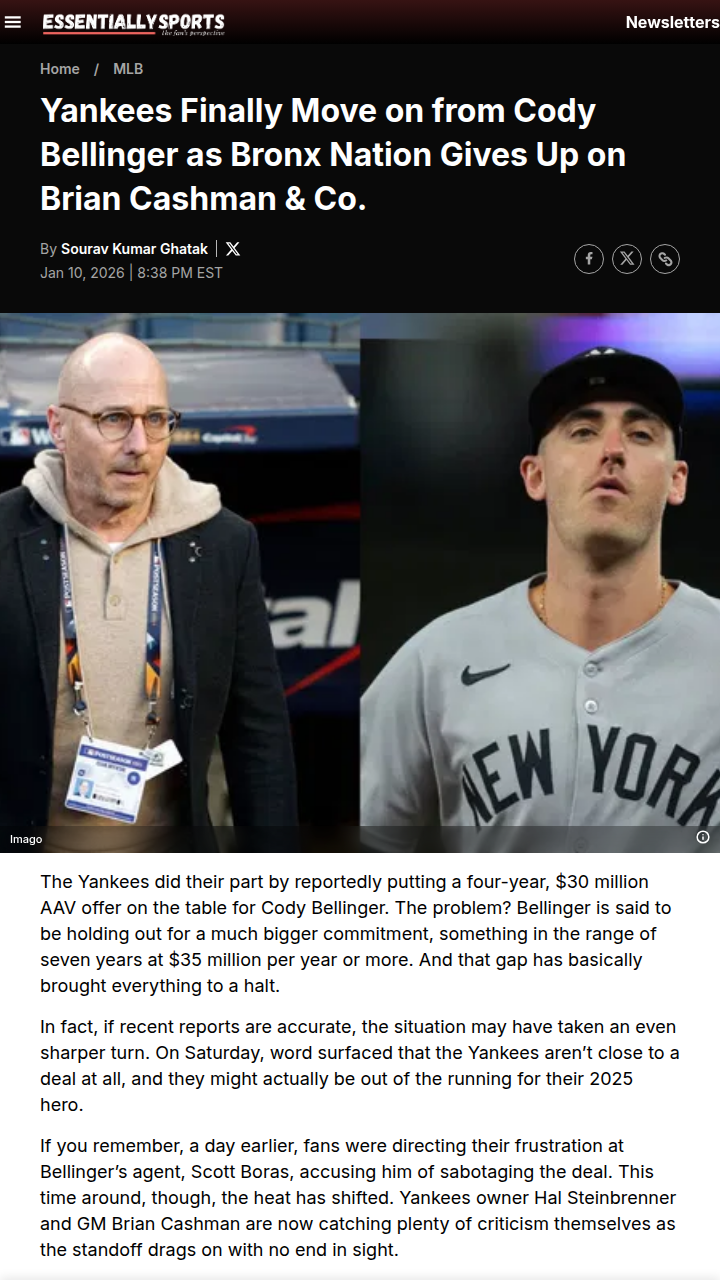 Maria Chavez+FollowYankees fans fume as Bellinger deal falls apartCody Bellinger looks set to leave the Bronx after contract talks with the Yankees hit a wall—he wanted a massive seven-year deal, but the front office wouldn’t budge. Fans are venting their frustration, not just at Bellinger’s agent, but now squarely at Hal Steinbrenner and Brian Cashman for a quiet offseason and lack of big moves. With rivals like the Orioles making splashy signings, the Yankees’ reluctance to spend is raising real questions about their commitment to winning. How do you feel about the team’s direction and the front office’s approach? #Sports #Baseball #Yankees40Share