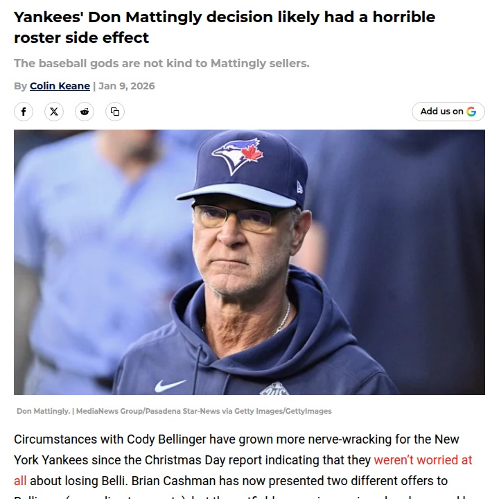 jillian59+FollowYankees’ Mattingly snub could cost them BichetteLosing out on Cody Bellinger was already a headache for the Yankees, but now there’s a real chance they’ll miss out on Bo Bichette too—all because they passed on bringing Don Mattingly back as bench coach. Turns out, Bichette is tight with Mattingly, who just joined the Phillies, and that’s reportedly making Philly the favorite to land him. Imagine the fallout if the Yankees end up empty-handed on both Bellinger and Bichette while Mattingly helps a rival. Would you have wanted Mattingly back in pinstripes? Let’s hear your take on this front office gamble! #Sports #Baseball #Yankees01Share