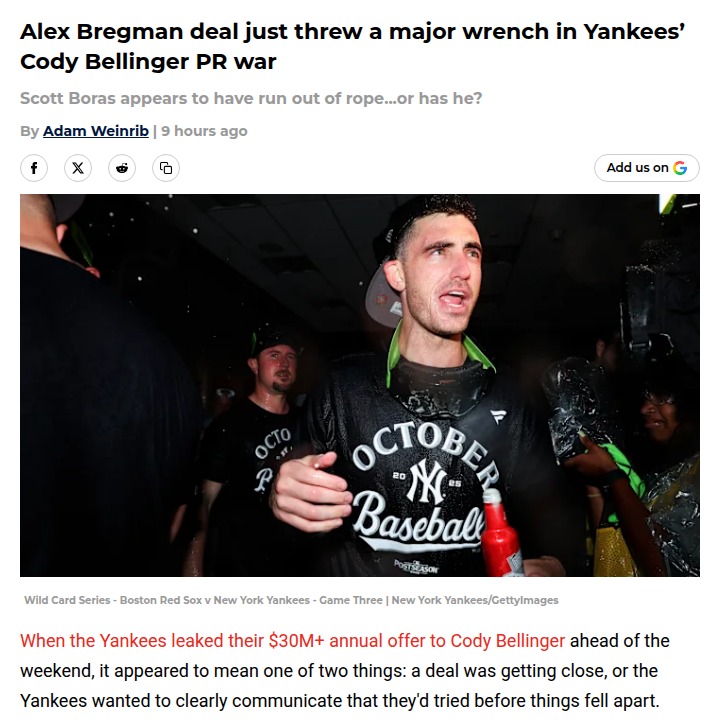 jillian59+FollowBregman Deal Shakes Up Yankees-Bellinger SagaWow, the Alex Bregman-to-Cubs bombshell just flipped the script on the Yankees’ pursuit of Cody Bellinger. The Yanks’ $30M+ offer looked strong, but now with Bregman’s massive payday, Boras has new ammo to push for more. The Bronx Bombers seem fed up with Boras’ tactics—are they really out, or is this just more hardball? Feels like the Bellinger sweepstakes just got a lot more interesting! #Sports #Baseball #Yankees10Share