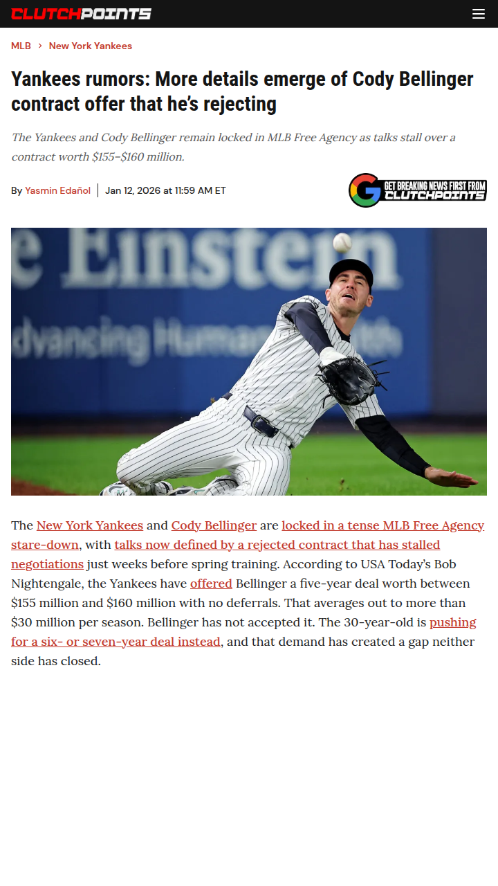 Cassandra Reed+FollowYankees, Bellinger, and the big contract standoffCody Bellinger and the Yankees are locked in a contract standoff that’s got everyone talking. Despite New York offering over $30 million a year for five years, Bellinger’s camp—led by agent Scott Boras—is holding out for at least seven years and $37 million per season. That’s a huge gap, especially since similar big-name hitters have settled for five-year deals this offseason. It feels like Boras is hoping for a last-minute miracle, but with the market cooling, will either side blink first? Is Bellinger worth breaking the mold for, or should the Yankees stand firm? #Sports #Baseball #Yankees00Share