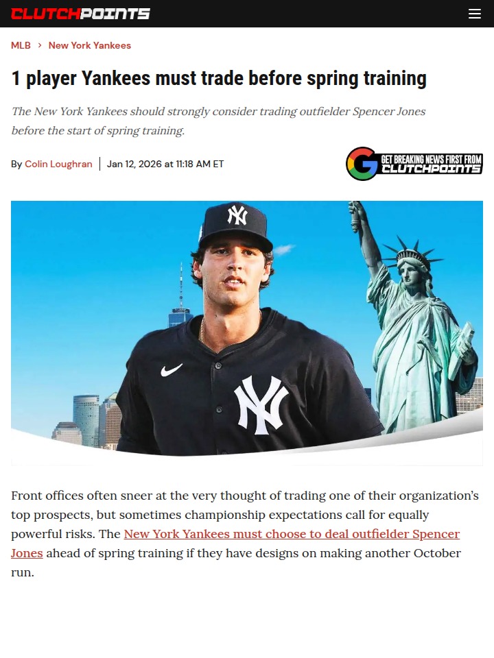 jillian59+FollowShould Yankees Deal Spencer Jones Now?Fellow Bronx Bombers fans, what’s your take on the Spencer Jones situation? With the outfield already stacked and rumors swirling about possible moves for big names like Kyle Tucker or Cody Bellinger, it feels like the Yanks might have to part ways with this top prospect to chase No. 28. Jones has the tools, but does he have a spot in the Bronx? Is now the time to cash in for a win-now piece? #Sports #Baseball #Yankees00Share