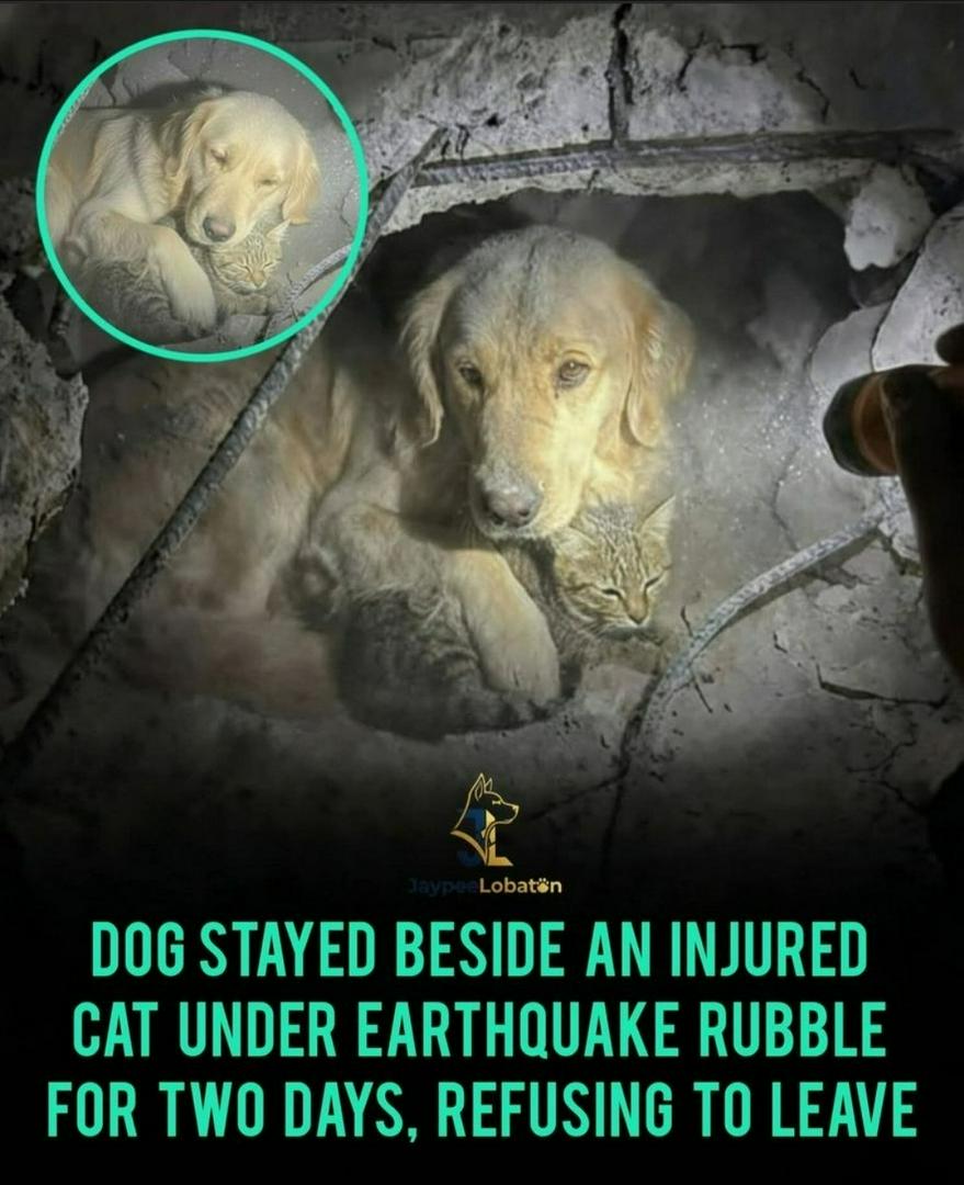 In the aftermath of a devastating earthquake, rescue teams uncovered a scene that left even the most seasoned responders speechless. Amid shattered homes and collapsed walls, one Golden Retriever lay beneath the rubble-not because he couldn't escape, but because he refused to leave his iniured companion. For two long days, this loval dog staved by the side of his cat sister. He could have slipped through the broken beams and debris. but instead. he chose to remain. He shielded her from falling fragments, kept her warm, and quarded her weakened body untin help arrived. When rescuers finally reached them, they found the cat injured and frightened, but alive--thanks to the unwavering commitment of her canine guardian. The Golden Retriever was exhausted dehydrated, and covered in dust, vet he rofucod to movd until thow conurod hic folinacompanion. The two were the only survivors from thein nome. Everything they once knew-walls possessions, memories-had crumbled. But in the middle of overwhelming loss, their bond remained intact. Their story quickly spread, capturing hearts worldwide as a symbol of devotion in the darkest of times t's easy to believe lovalty is instinct. But noments like these reveal somethinc deeper. When faced with fear, danger, and freedom, this dog chose compassion over survival. He chose love over escape. In a world where disaster often brings out panic and despair, this Golden Retriever showed us what courage can look like: staying wher walking away would be easier. This powerful moment is a reminder that heroes don't alwavs wear uniforms Sometimes, they have fur, gentle eyes, andhearts big enough to protect others-even when the world is falling apart. #EarthquakeSurvivor #GoldenRetriever #AnimalRescue #UnbreakableBond #PetLoyalty #SurvivalStory #NewsBreak #Animals #
