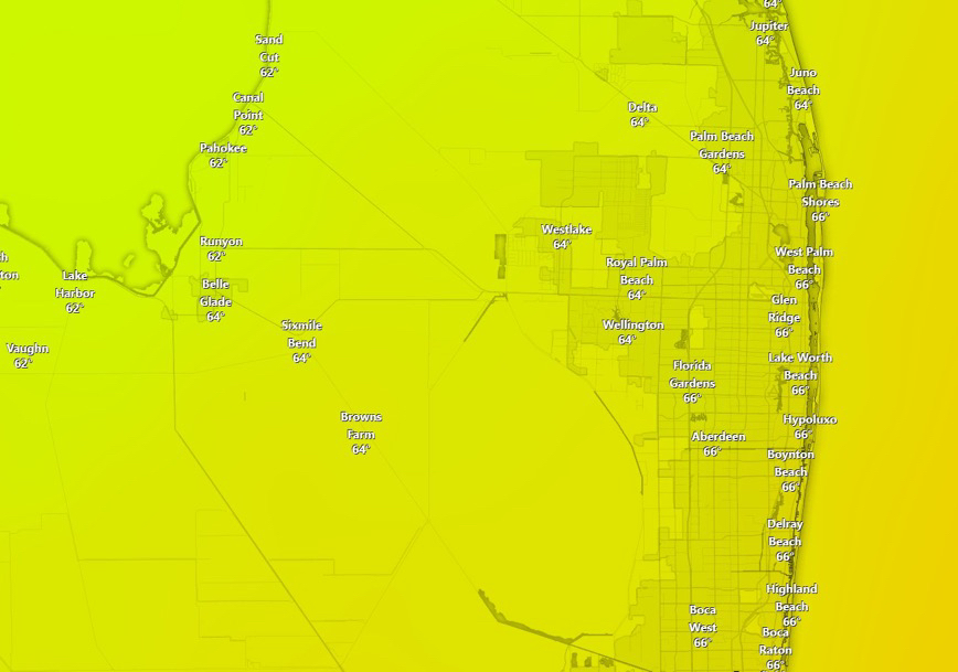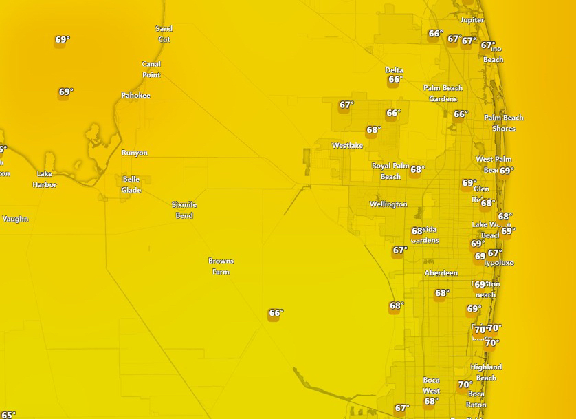 PALM BEACH COUNTY WEATHER+FollowPalm Beach County, Florida: Showing The Current Reported Temps 1st photo. 2nd Photo for This Afternoon Today with breezy conditions. Cloudy with a chance of more Showers This Early Morning and Towards the Late Afternoon. #flwx #spc #PalmBeachCounty 00Share