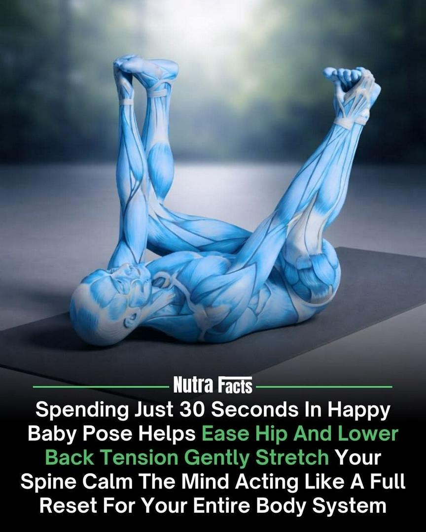 Spending just 30 seconds in Happy Baby Pose can have a surprisingly powerful effect on both the body and the mind. This gentle yoga posture opens the hips, releases deep tension in the lower back, and allows the spine to decompress naturally. Many people carry stress in their hips and lumbar area from long hours of sitting, poor posture, or emotional tension, and this pose directly targets those tight areas. As you draw the knees toward the chest and gently rock side to side, the spine receives a soft massage that helps improve circulation and reduce stiffness. This movement encourages relaxation in muscles that are often chronically tight, promoting better mobility and comfort almost immediately. Even a short hold can signal the nervous system to let go of stored tension. Beyond the physical benefits, Happy Baby Pose has a calming effect on the mind. The position naturally encourages slow, deep breathing, which activates the parasympathetic nervous system. This helps reduce stress hormones, quiet racing thoughts, and create a sense of mental reset. Many people describe feeling grounded, lighter, and more centered after just half a minute. Because it’s simple, gentle, and requires no equipment, this pose can be done anywhere—on the floor, on a mat, or even before bed. Sometimes, the most effective reset doesn’t come from intense effort, but from a brief moment of mindful movement that brings the whole body back into balance. #NutraFacts #fblifestyle #Stretching #BackPain #Relaxation