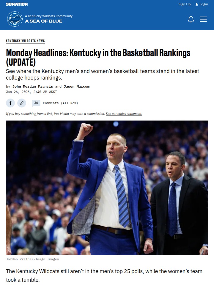 Brian Gaines+FollowKentucky hoops: Rankings drama & SEC streaksKentucky basketball is stirring up debate—despite not cracking the men’s top 25 polls, the Wildcats have quietly racked up five straight SEC wins after a rocky start. Meanwhile, the women’s team is facing its first three-game losing streak under Coach Kenny Brooks. With both squads bouncing around in various rankings, fans are left wondering: are the polls missing something, or are the numbers spot on? Next up, the men face tough road games against Vanderbilt and Arkansas, while the women look to rebound at Arkansas. Where do you think these teams truly belong in the rankings? #Sports #Basketball #KentuckyBasketball00Share