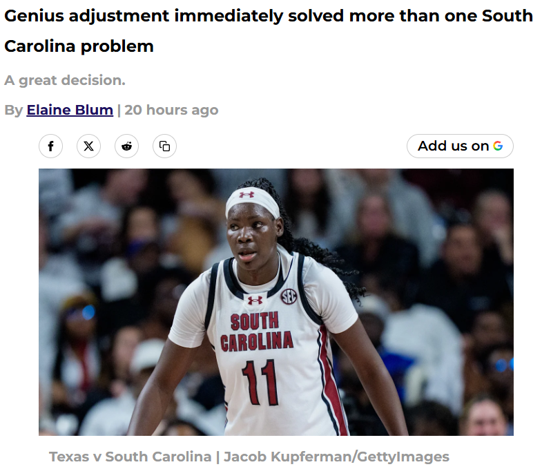 GalacticGiraffe+FollowHow a bold lineup switch powered South CarolinaDawn Staley’s decision to shake up the Gamecocks’ starting five paid off in a big way. By moving Agot Makeer into the lineup and letting Madina Okot come off the bench, South Carolina not only found a faster, more dynamic rhythm but also gave Okot a chance to reset and regain her confidence. The result? Okot delivered her best game yet against a top opponent, and the team’s bench finally brought some real firepower. It’s a reminder that sometimes, the right tweak can unlock a whole new level. Would you stick with this lineup or go back to the old setup? #Sports #Gamecocks #SouthCarolina00Share