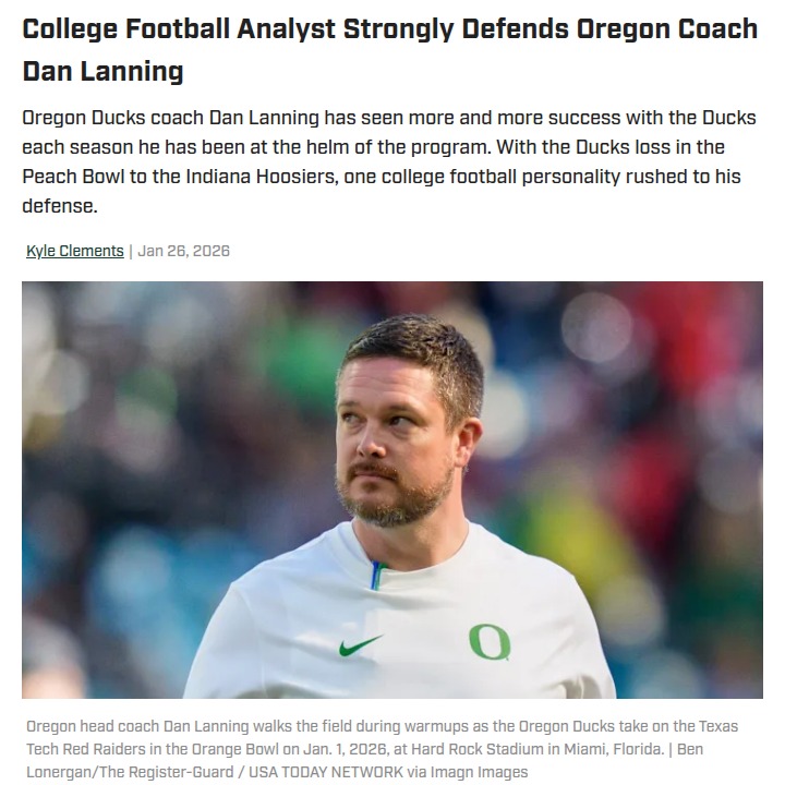 Chad Williams+FollowOregon’s Dan Lanning faces big expectationsOregon fans are buzzing as the Ducks gear up for 2026 with Dante Moore and a stacked roster, but all eyes are on Coach Dan Lanning. Despite back-to-back tough playoff exits, college football analyst Josh Pate says Lanning’s progress shouldn’t be overlooked—he’s already taken Oregon further than most expected and is still early in his career compared to legends like Saban. With a 48-8 record and a Big Ten title, is the criticism fair, or is Lanning building something special in Eugene? What do you think—does he deserve more credit or more pressure? #Sports #Football #OregonDucks00Share