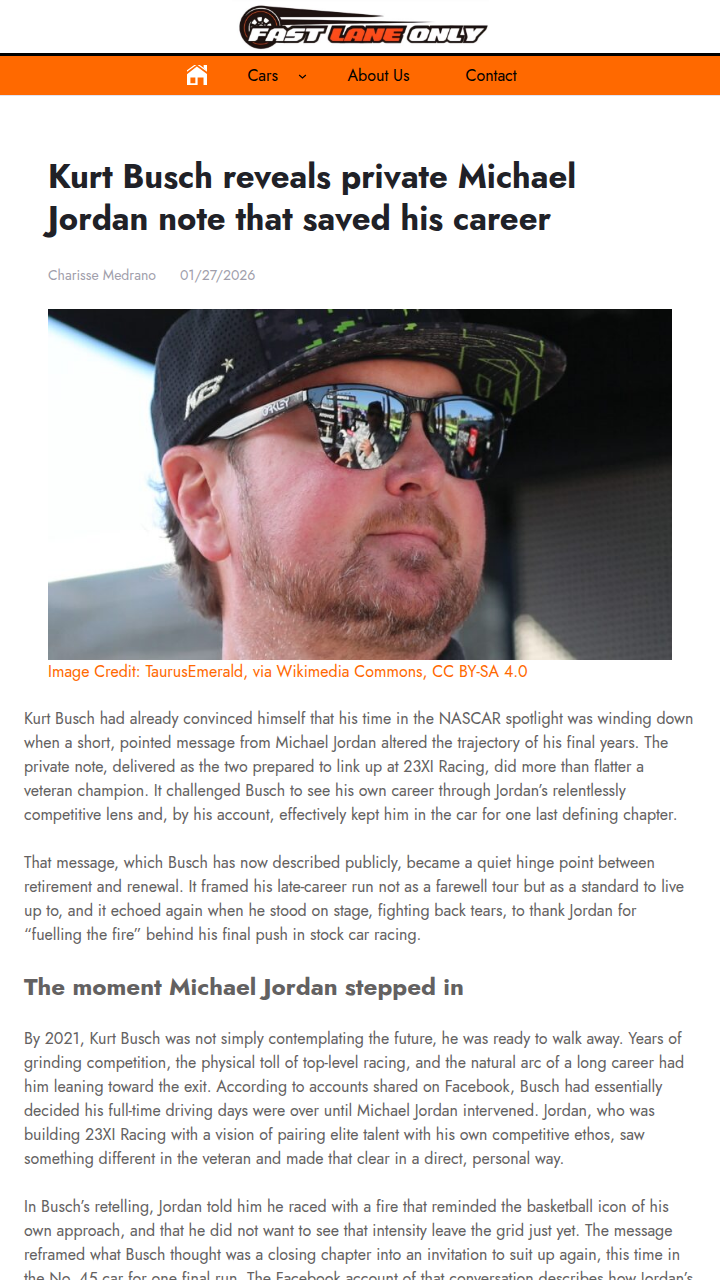 Roger Franco+FollowMJ’s Note Ignites Kurt Busch’s Final LapDid anyone else get chills hearing Kurt Busch open up about the private message from His Airness, Michael Jordan? Just when Rowdy was ready to hang up his helmet, MJ dropped a line that flipped the script—turning what looked like a farewell tour into a legit last dance. That Kansas win in the No. 45 wasn’t just a stat; it was proof that the GOAT’s fire is contagious. Anyone else think this is one of NASCAR’s most underrated late-career revivals? #Sports #Racing #KurtBusch00Share