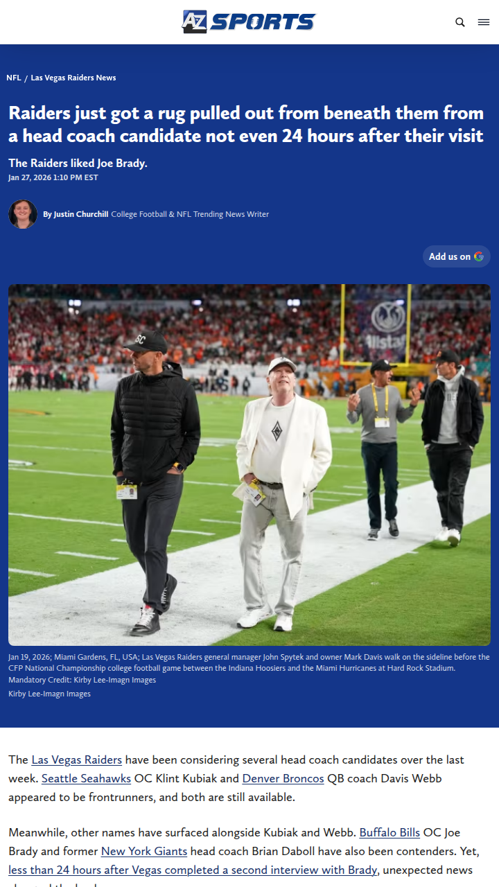 Michael Pitts+FollowRaiders Lose Joe Brady in Coaching ShuffleTough break for Raider Nation! Just as it looked like Joe Brady might be the Silver & Black’s next head coach, the Bills swooped in and locked him up with a five-year deal. Brady’s QB whisperer resume would’ve been perfect for a young gun like Mendoza, but now the Raiders’ search is down to Webb or Daboll. With Kubiak still prepping for the Super Bowl, who do you want to see leading the charge in Vegas? #Sports #Football #Raiders00Share