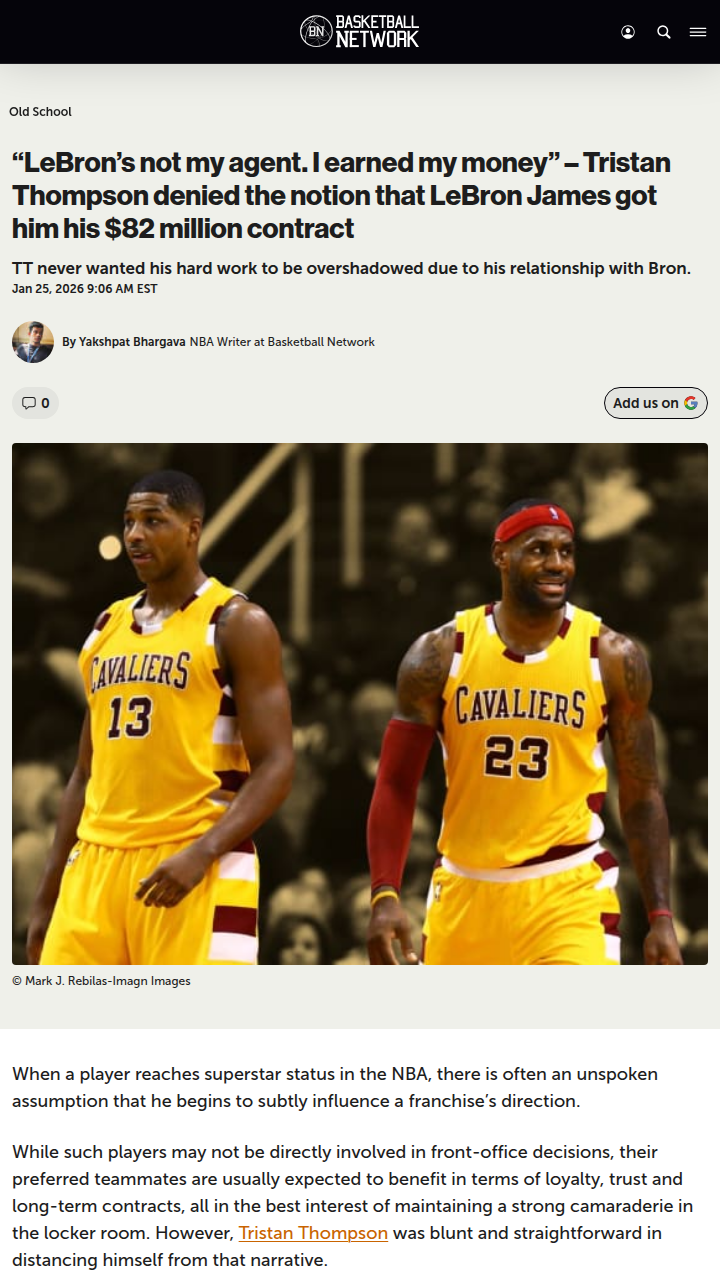 Patrick Gonzales+FollowTT Shuts Down 'King James' Contract RumorsCavs fans, what do you think about Tristan Thompson setting the record straight? TT made it clear his $82M deal wasn’t a King James handout—he says he earned every penny with hustle and heart. Sure, he and LeBron are tight, but TT’s playoff grind and rebounding made him a key piece in the Cavs’ Finals run. Do you buy his claim, or does LeBron’s shadow loom over every big Cavs contract? #Sports #Basketball #CavsNation00Share