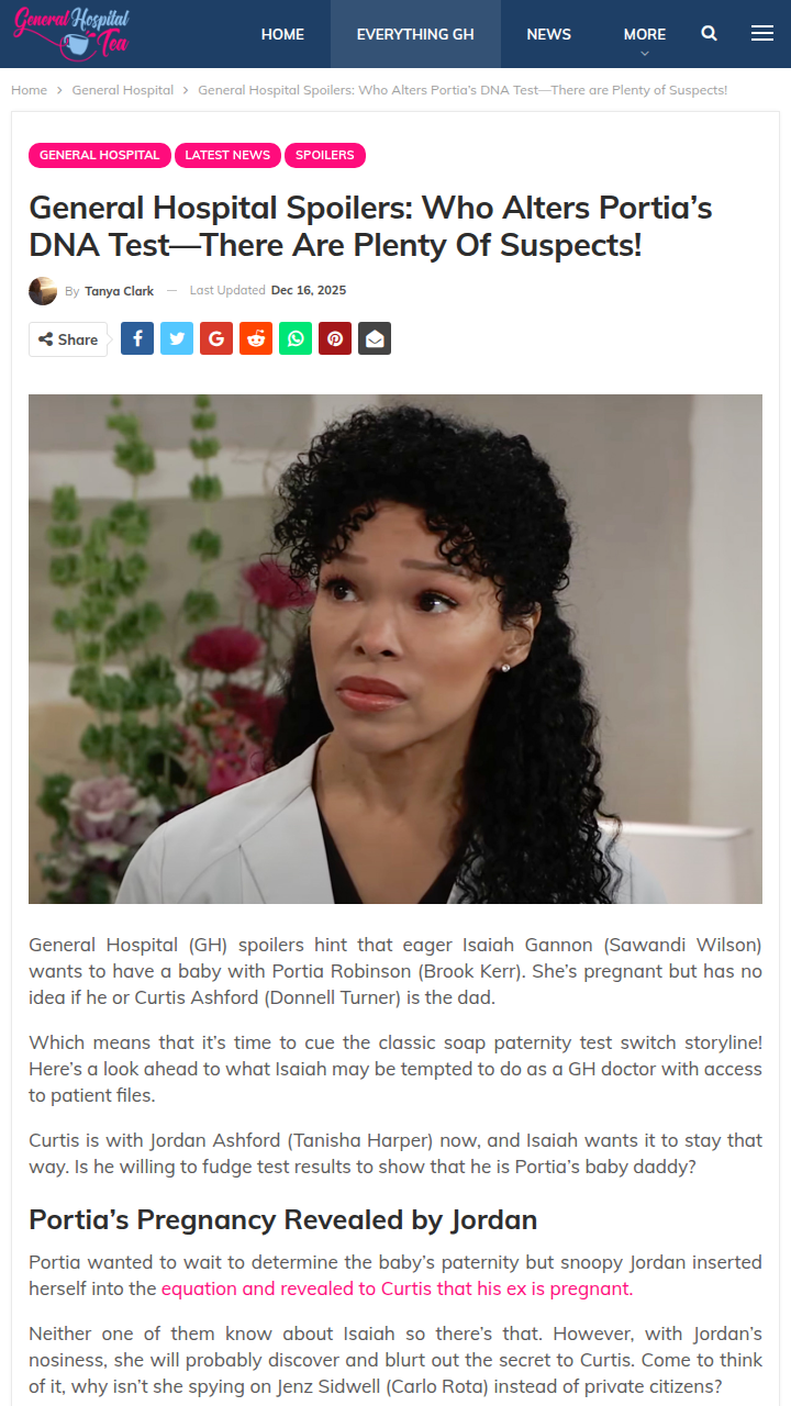 Ryan Massey+FollowPortia’s DNA Test Drama! 🧬Portia’s pregnancy has everyone at GH buzzing, but the real tea is about her baby’s paternity test. Fans are convinced someone’s going to tamper with the results—Isaiah, Jordan, Trina, or even Portia herself! With so many motives flying around, who do you think will pull off the classic soap switcheroo? Is Isaiah desperate enough to fake being the dad, or will Jordan sabotage things for her own reasons? This paternity plot is about to explode! #Entertainment #TVSeries #GeneralHospital151Share