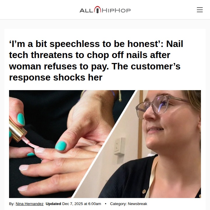 Jennifer ArnoldFollowingNail Tech Drama 💅: Customer Chooses Chop Over PayCaught this wild TikTok where an Aussie nail tech literally threatens to chop off a client’s nails when she refuses to pay the full amount. The twist? The customer just says, “Take them off, they’re not that good.” People are split—some say $100 is too much, others blame the customer for being cheap. The exchange rate confusion in the comments is next level. Would you ever let someone cut off your fresh set over $50? #Entertainment #TVSeries #NailTechDrama00Share
