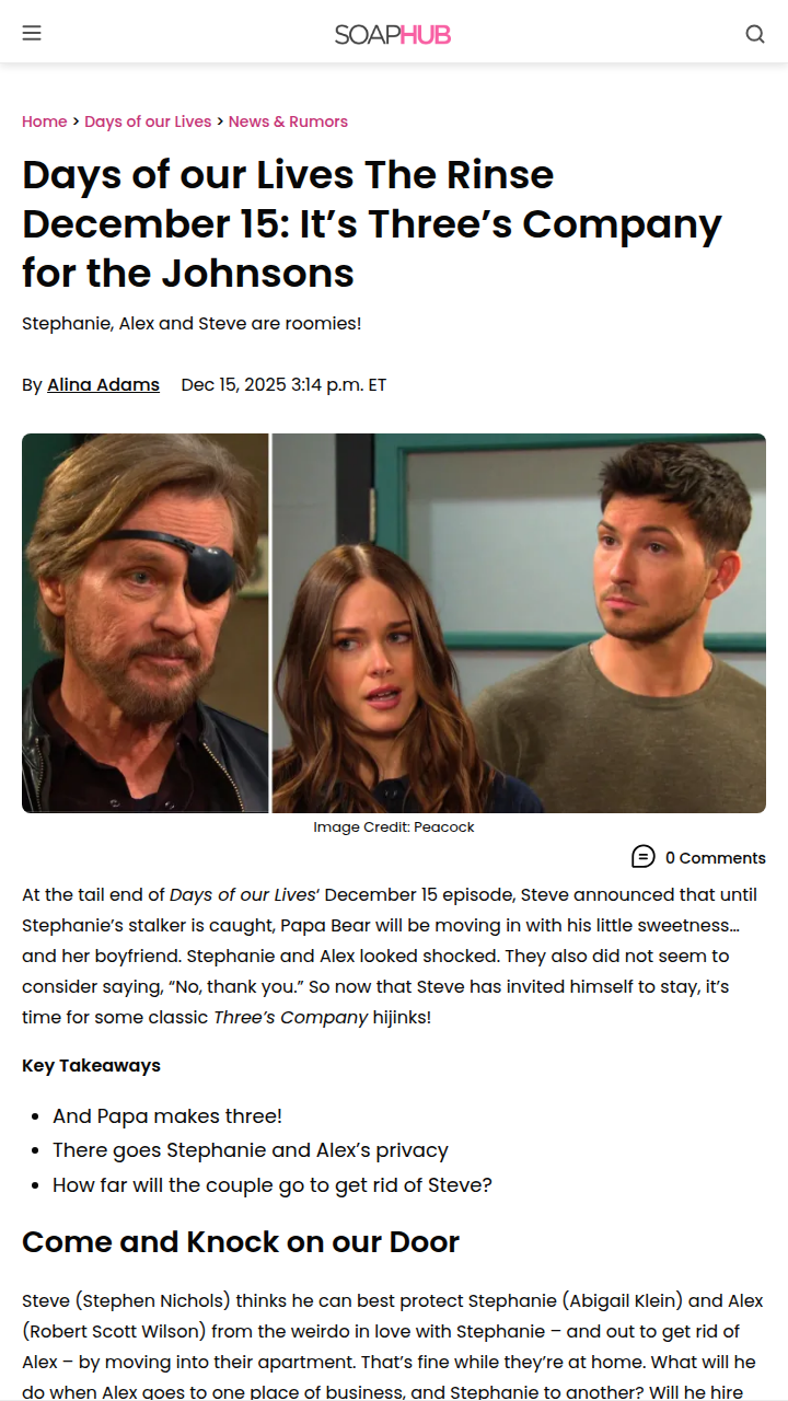Jennifer ArnoldFollowingSteve Moves In—Johnson Family Chaos! 🏠Steve just dropped a bomb on Stephanie and Alex—he’s moving in until Stephanie’s stalker is caught! The look on their faces said it all: privacy, gone. Fans are already debating if Steve’s overprotective move will push the couple to their breaking point. Will Stephanie and Alex team up to get rid of him, or will this turn into a hilarious Three’s Company situation? Let the hijinks begin! #Entertainment #TVSeries #DaysOfOurLives00Share