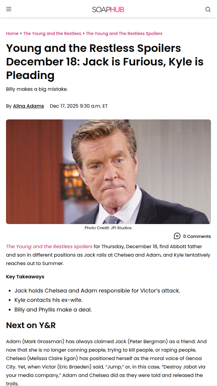 Eric Mueller+FollowJack Explodes at Chelsea & Adam! 😱Jack is absolutely losing it over Chelsea and Adam's latest move—he’s blaming them for Victor’s attack and demanding they own up. Meanwhile, Kyle is crawling back to Summer for help, which has fans split: is he just desperate or playing some deeper game? And don’t even get me started on Billy and Phyllis teaming up again—disaster incoming? The Abbott family drama is next-level messy right now! #Entertainment #TVSeries #YR00Share