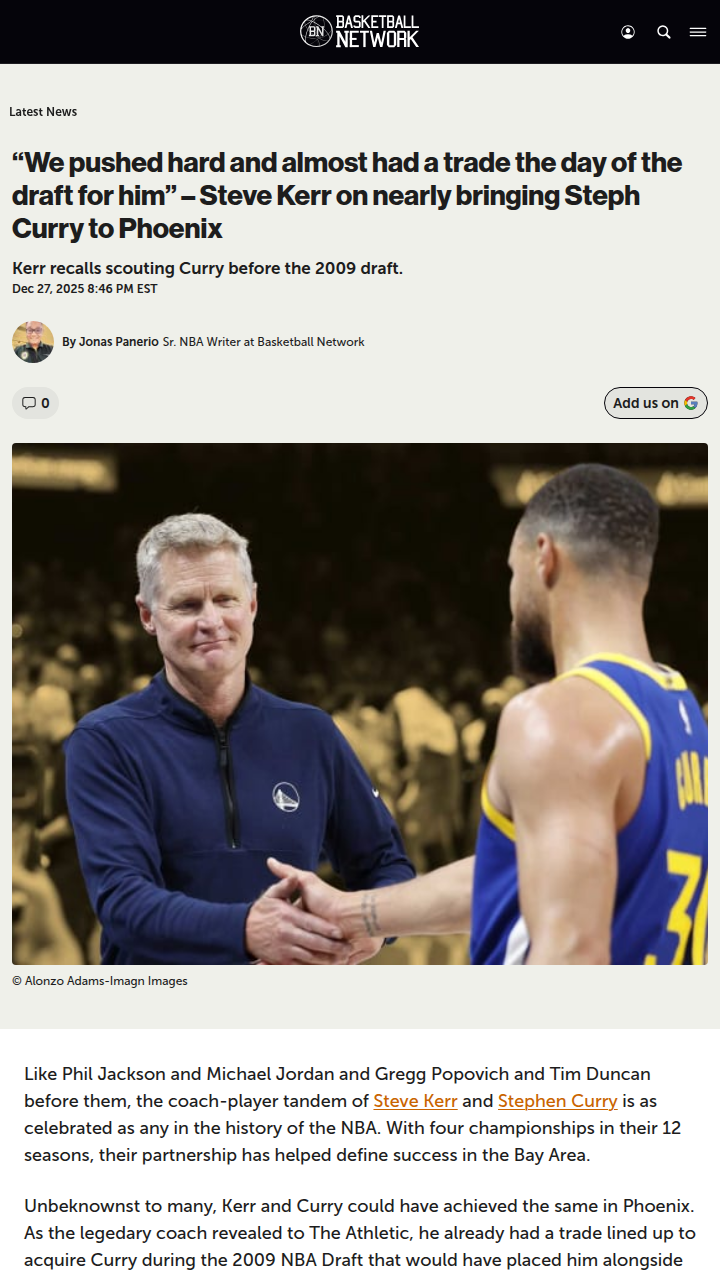 guerrajohn+FollowWhat If Steph Joined the Suns in 2009?Can you imagine Chef Curry running with Nash and Amar'e in Phoenix? Steve Kerr just revealed he almost pulled off a draft-day trade to bring Steph to the Suns in 2009. The deal fell through, and the rest is Bay Area history. Warriors fans, do you think Curry would’ve become a legend anywhere, or was the Kerr-Curry partnership in Golden State just meant to be? #Sports #Basketball #Warriors00Share